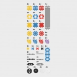 - Briques de différentes formes (plateformes, triangles, fenêtres, échelles, 3 types d’axes), guide illustré, sachet pour lavage au lave-vaisselle, boîte en carton