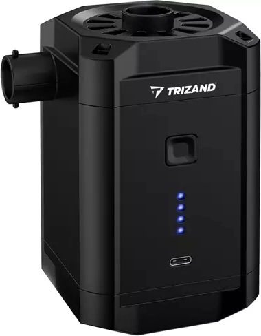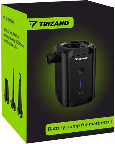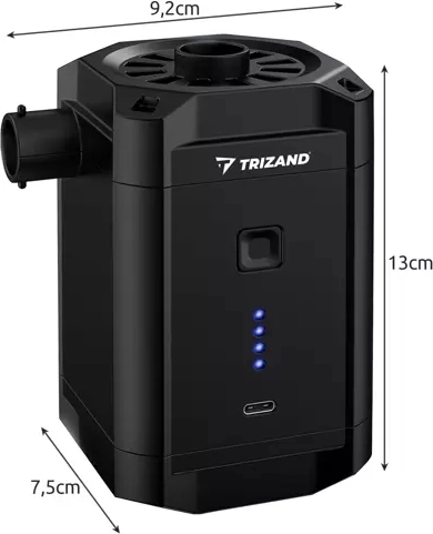 La pompe sans fil Trizand est un assistant utile à chaque voyage. Grâce à ses trois embouts interchangeables, elle peut gonfler les matelas, ballons, pontons et autres objets gonflables. Compacte et facilement transportable, elle constitue le compagnon idéal pour le camping ou la plage.