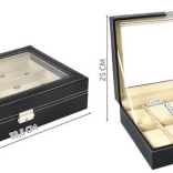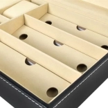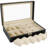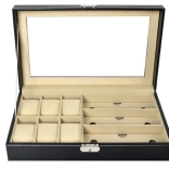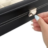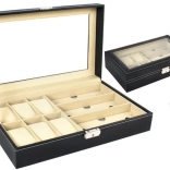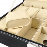 Cet organiseur noir élégant, avec surpiqûres blanches, allie allure représentative et praticité. Son couvercle vitré permet une présentation claire du contenu, tandis que des compartiments séparés avec doublure douce protègent montres, lunettes et autres bijoux des rayures et des contacts indésirables.
