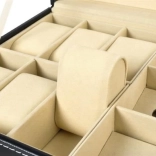 Des compartiments séparés, aux parois rehaussées, avec coussins amovibles, offrent un maintien stable pour différents types de montres et de lunettes et évitent tout contact entre eux.