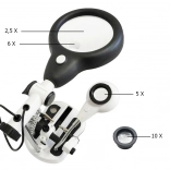 La grande lentille de 10,4 cm et la petite lentille interchangeable de 2,8 cm offrent des grossissements de 2,5x, 5x, 6x et 10x pour un travail détaillé en électronique comme en mécanique.