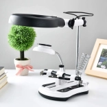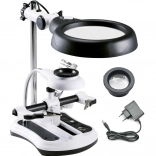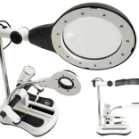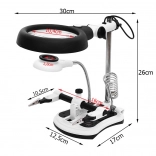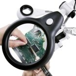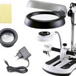 Loupe de travail professionnelle avec éclairage LED intégré et système de « troisième main » pour faciliter toutes les opérations nécessitant une précision maximale. La grande lentille de 10,4 cm avec éclairage et la petite lentille interchangeable permettent un contrôle détaillé, le soudage et le collage de petites pièces.