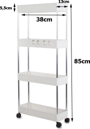 Višenamjenski ormarić na kotačima idealno je rješenje za skučen prostor u kupaonici ili kuhinji. Četiri prostrane police i kuke pružaju dovoljno prostora za organizaciju svih potrebnih stvari.
