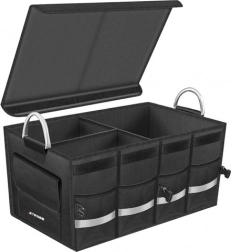 Čvrsto MDF dno stabilizira teret, a sklopivi poklopac s čičkom štiti sadržaj i kada smanjite volumen organizatora. Ništa se neće prosipati i prtljažnik ostaje čist.