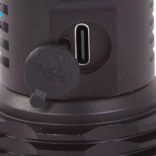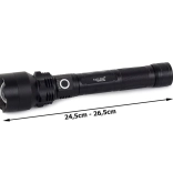 Robusno kućište od zrakoplovnog aluminija s tvrdo eloksiranom površinom otporno je na udarce i zaštićeno je prema IPX5. Protuklizna površina, ergonomska ručka i remen povećavaju sigurnost držanja. Dva akumulatora 26650 osiguravaju dugu autonomiju, USB punjenje praktično je na terenu, a LED indikator prikazuje stanje napunjenosti. Dostupna su 3 načina rada – 100 %, 50 % i stroboskop.
