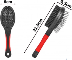 Dvostrana četka je univerzalan alat za redovno održavanje dlake vašeg ljubimca. Metalne iglice s okruglim završecima nježno rasčešljavaju čvoriće i pomažu tijekom linjanja, dok guste najlonske čekinje uklanjaju prašinu, zaglađuju i daju dlaci zdrav sjaj. Prikladna je za kratku, dugu, valovitu i grubu dlaku.