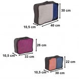 Set putnih organizatora pomaže vam razdvojiti odjeću i dodatke tako da sve ostane pregledno i na svom mjestu. Četiri kocke različitih veličina idealne su za majice, donje rublje i pulovere, dok će zasebna vrećica za cipele i praktična torbica za sitnice ostatak opreme održati čistim i sigurno pospremljenim.