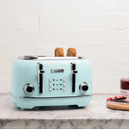 Tirkizni toster HERITAGE od nehrđajućeg čelika idealan je izbor za brzo i ravnomjerno pečenje peciva. Zahvaljujući četirima širokim utorima, lako ćete umetnuti i deblje kriške kruha ili bagele, a funkcija centriranja osigurava jednoliko pečenje s obje strane.