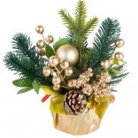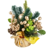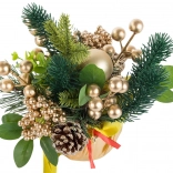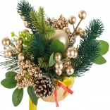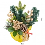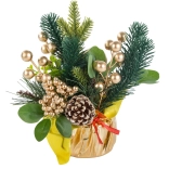 Ova božićna aranžmana donosi harmoniju tradicionalnih boja i materijala. Bogate zelene grančice, zlatne bobice i kuglice nadopunjuje prirodni češer smješten na stabilnoj zlatnoj bazi s mašnom. Ukras lijepo reflektira svjetlo i stvara ugodnu, svečanu atmosferu u dnevnoj sobi, blagovaonici ili uredu.