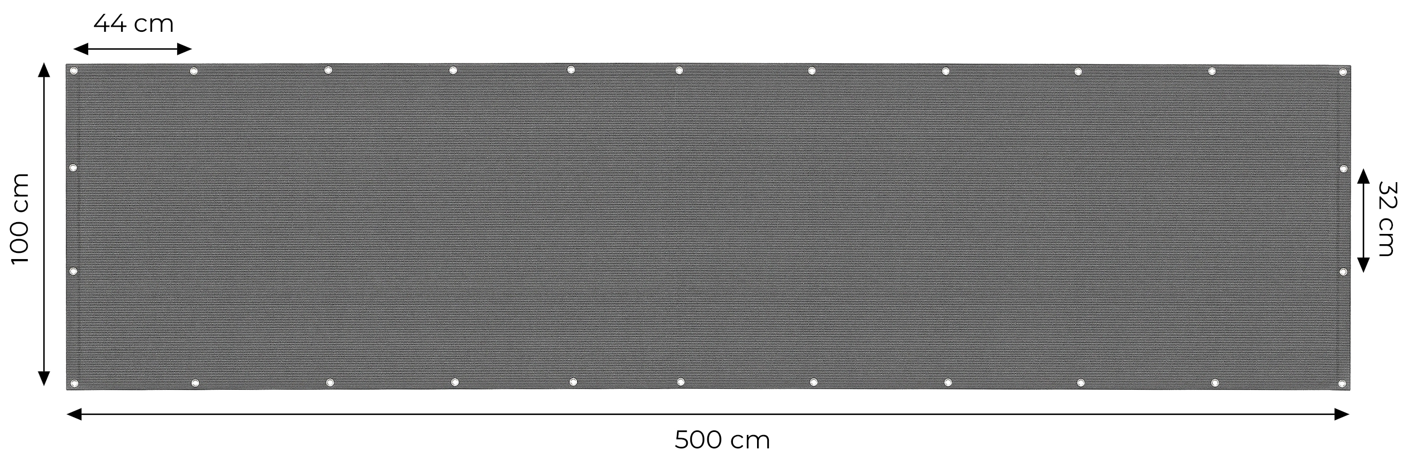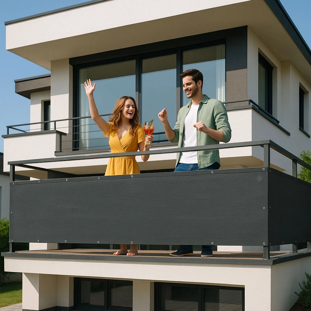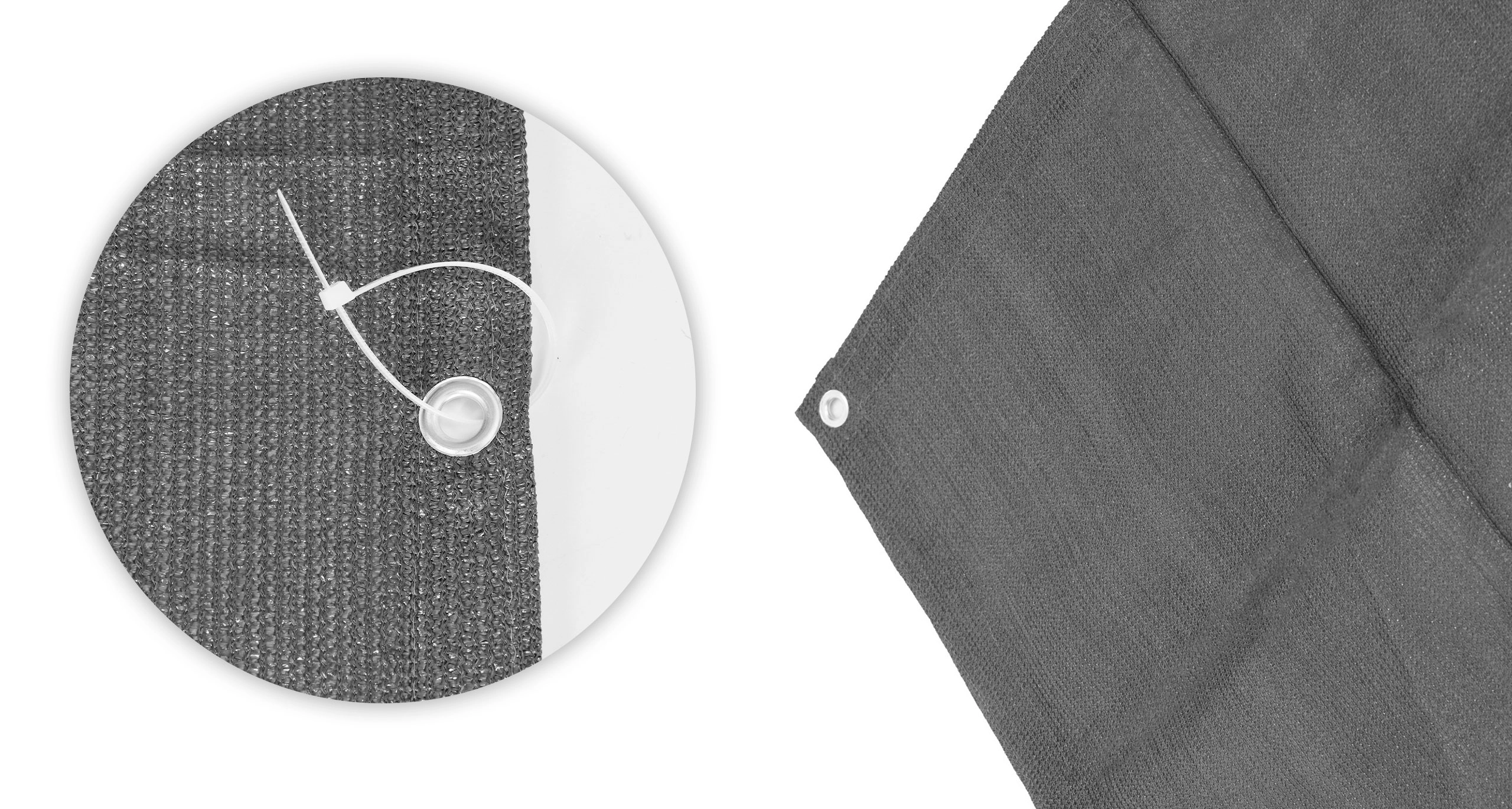 Paket uključuje aluminijske očice smještene na približno svakih 40 cm duž rubova, osiguravajući stabilno i dugotrajno pričvršćivanje na ogradu. Zahvaljujući otpornosti na koroziju, ostaju funkcionalne i estetske čak i nakon dugotrajne vanjske upotrebe. Montažni set sadrži 26 vezica i 2 osammetarske uzice za brzu instalaciju na obje strane ograde. Fleksibilna konstrukcija omogućuje jednostavnu prilagodbu različitim balkonima i terasama.