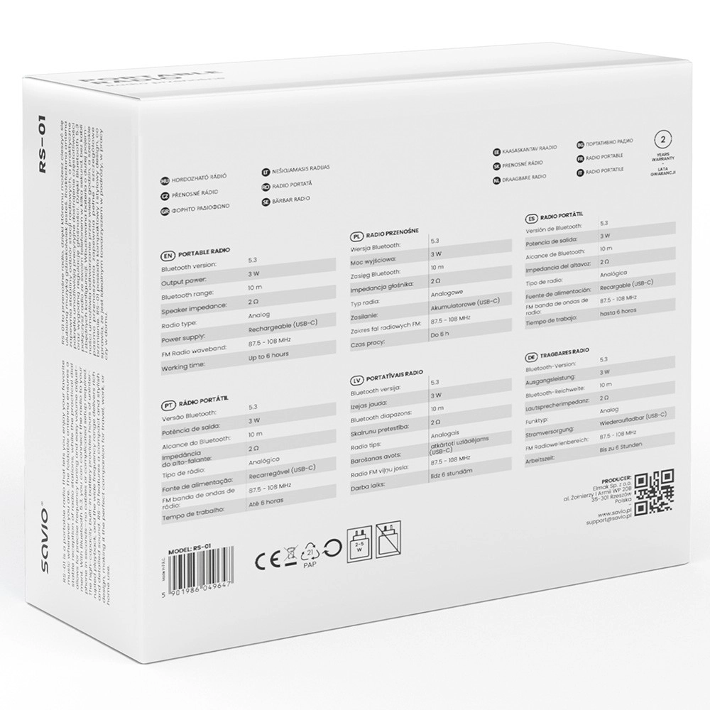 Kompaktan i lagan prijenosni radio SAVIO RS‑101 donosi čist i uravnotežen zvuk kod kuće i na putu. Zahvaljujući FM radiju, Bluetoothu 5.3, AUX ulazu i punjenju putem USB‑C lako ćete slušati omiljene postaje i glazbu s telefona. Izvlačna antena osigurava stabilan prijem, a ugrađena baterija nudi do 6 sati slušanja u elegantnom retro dizajnu.
