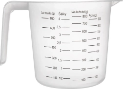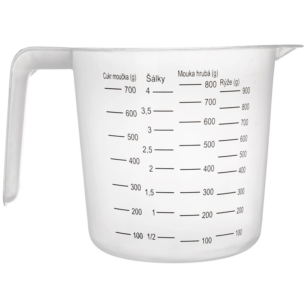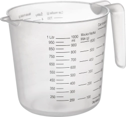 Praktična kuhinjska mjerná posuda zapremnine 1 l u obliku udobne šalice s ručkom i izljevom. Izrađena je od izdržljive i zdravstveno ispravne prozirne plastike, laka je i dobro leži u ruci. Nudi precizne mjerne skale za tekućine i sipke sastojke te olakšava mjerenje u svakoj kuhinji.