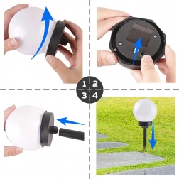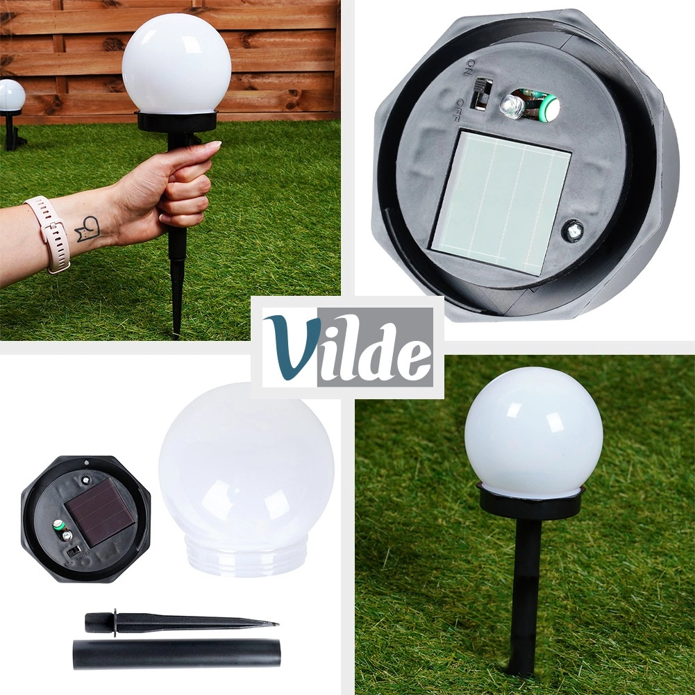 Svaka lampa sastoji se od globusa, produžne šipke i šiljka za lako zabijanje u tlo. Integrirani senzor sumraka automatski pali lampu nakon mraka, a prekidač omogućuje ručnu kontrolu. Zahvaljujući IP44 svjetla su otporna na prskajuću vodu i prašinu.