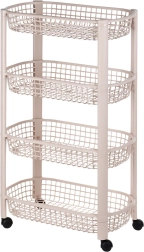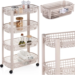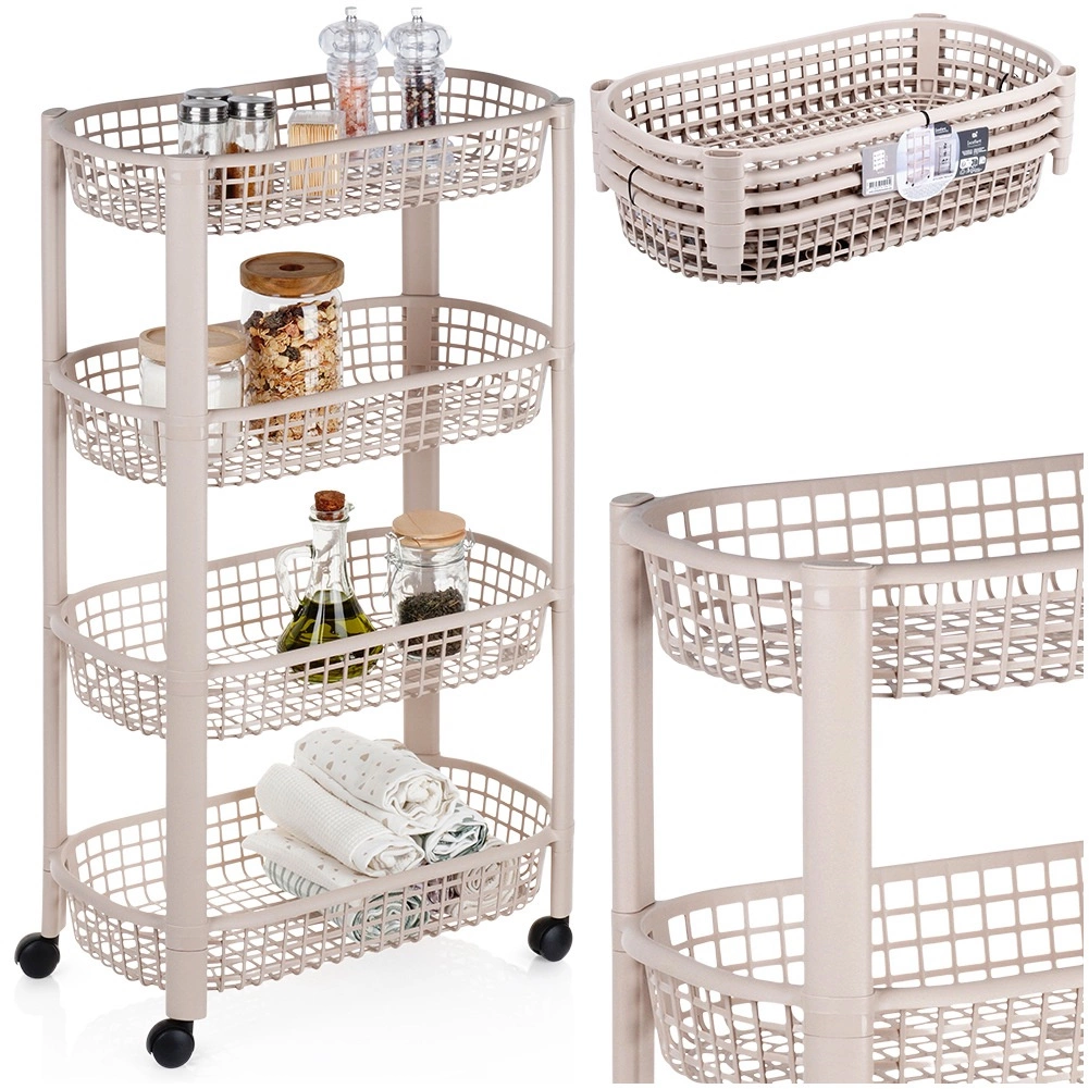 Praktična pokretna polica s četiri košare nudi uštedu prostora, velik kapacitet i laku mobilnost zahvaljujući četirima kotačićima. Laka i stabilna konstrukcija od izdržljive plastike u bež boji uklapa se u kuhinju, kupaonicu, ured i radionicu te osigurava pregledno i prozračeno odlaganje stvari.