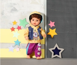 Stilska street odjeća BABY born za lutke 43 cm donosi majicu s kapuljačom 2-u-1 s prslukom u traper izgledu i udobne trenirke u boji kupine. Veseli otisci životinjica i zvjezdica potiču maštu i dugotrajnu igru, odijevanje je jednostavno zahvaljujući kvalitetnoj izradi, a u pakiranju se nalazi i praktična vješalica.