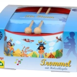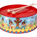 Dječji bubanj s indijanskim uzorkom promjera 20 cm oduševit će male glazbenike. Izrađen je od metala, dopunjen tkaninom i dvjema drvenim palicama. Dio pakiranja je i uzica za vješanje oko vrata. Podržava razvoj koordinacije, ritma i ljubavi prema glazbi.