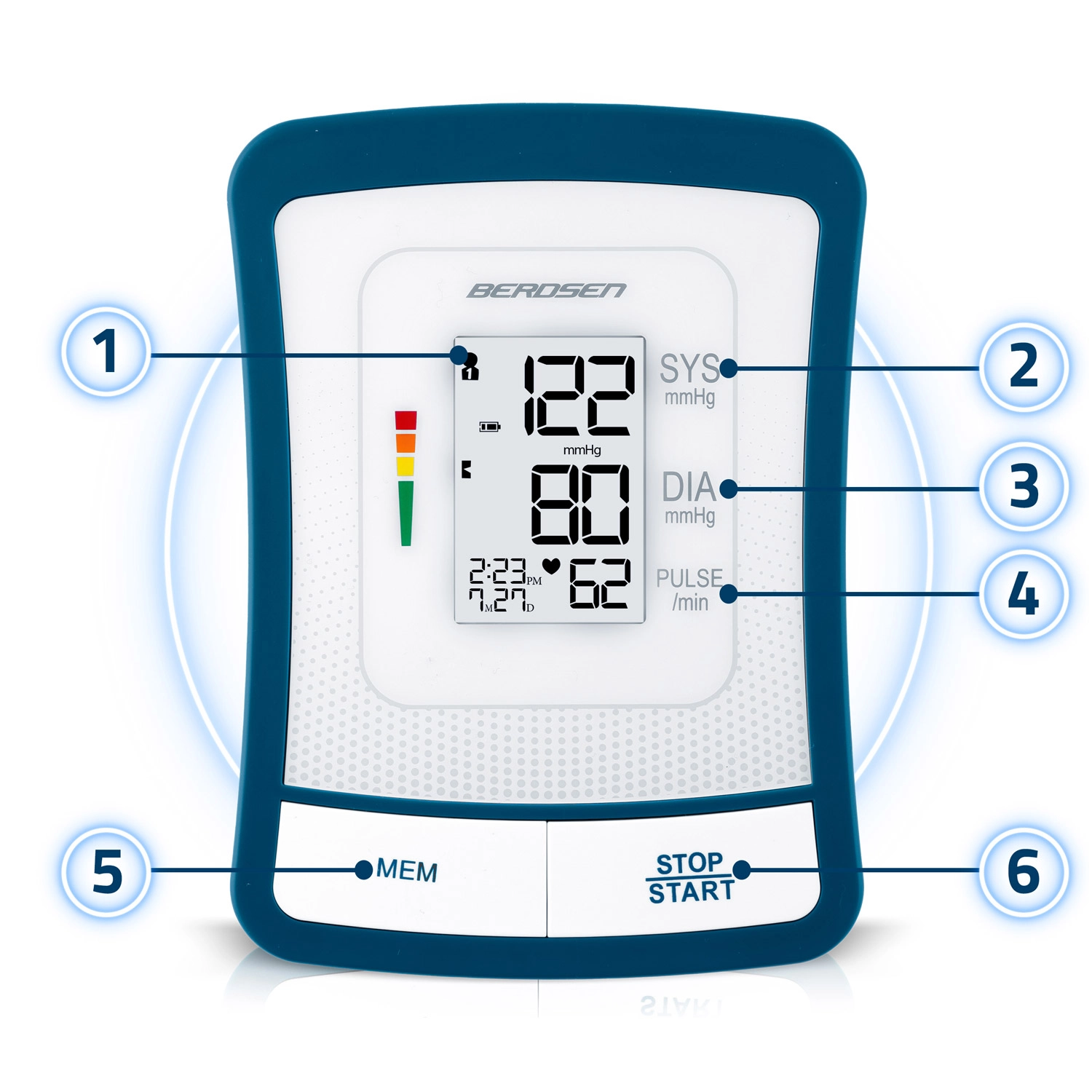 Tlakomjer BERDSEN BD-120 pouzdan je pomoćnik za svakodnevnu kontrolu zdravlja. Zahvaljujući velikom LCD zaslonu s jasnim prikazom sistole, diastole i pulsa, rezultate vidite odmah i bez napora. Uređaj upozorava na nepravilan srčani ritam, ima zvučni signal, automatsko isključivanje i indikator stanja baterije.