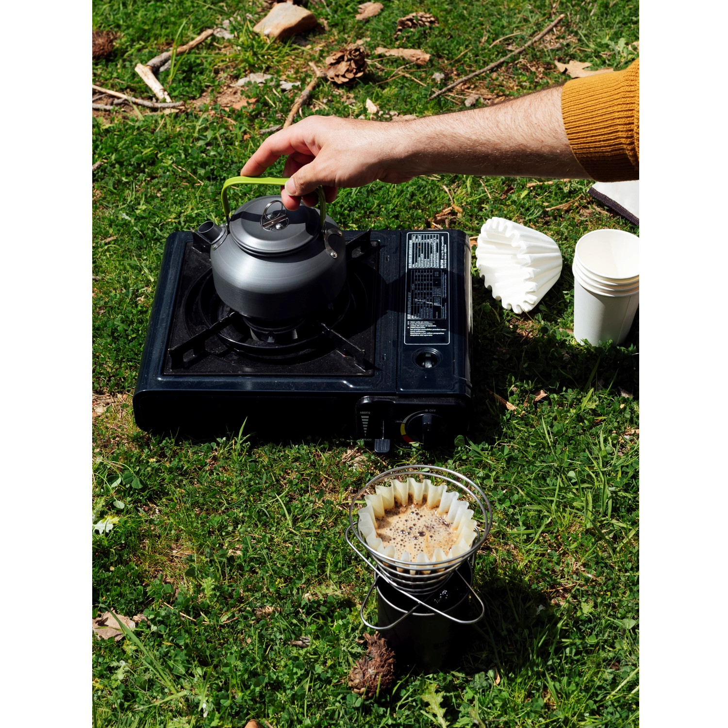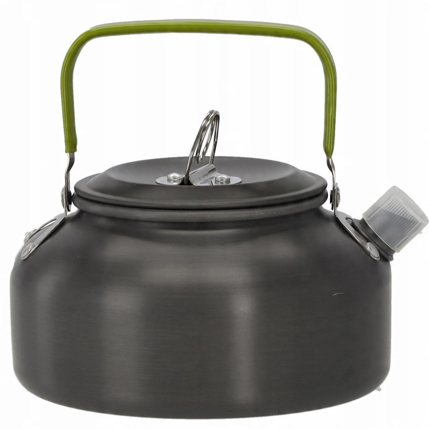 Lagani metalni čajnik sa širokim dnom osigurava stabilnost na kuhalu i brz zavretek – idealno za kavu ili čaj na putu.