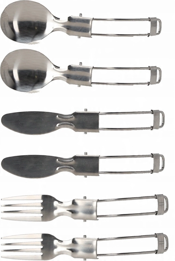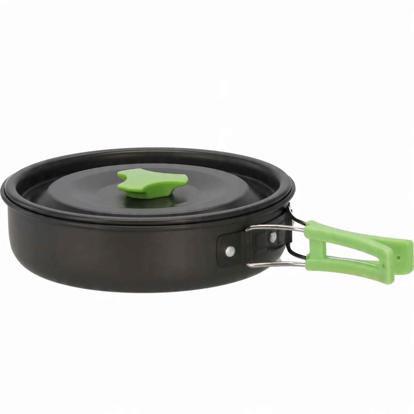 Posuđe je dizajnirano za brzo i praktično kuhanje u kampu: čvrsti materijali podnose često korištenje, sklopive zelene ručke štede prostor i olakšavaju rukovanje. Metalne šalice, sklopivi pribor i navojne karabine upotpunjuju opremu kako biste imali sve pri ruci.
