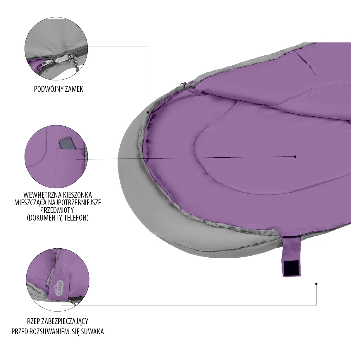 Praktični obostrani patentni zatvarač sa strane i u donjem dijelu omogućuje lako prozračivanje i potpuno rasklapanje u deku za toplije noći. Patent je osiguran širokom manžetom s čičak-trakom kako se pri kretanju ne bi otvarao. Anatomska kapuljača sa zateznom uzicom smanjuje gubitak topline. U kompletu je kompresijska vreća s remenima koja nakon zatezanja smanjuje obujam približno za trećinu.