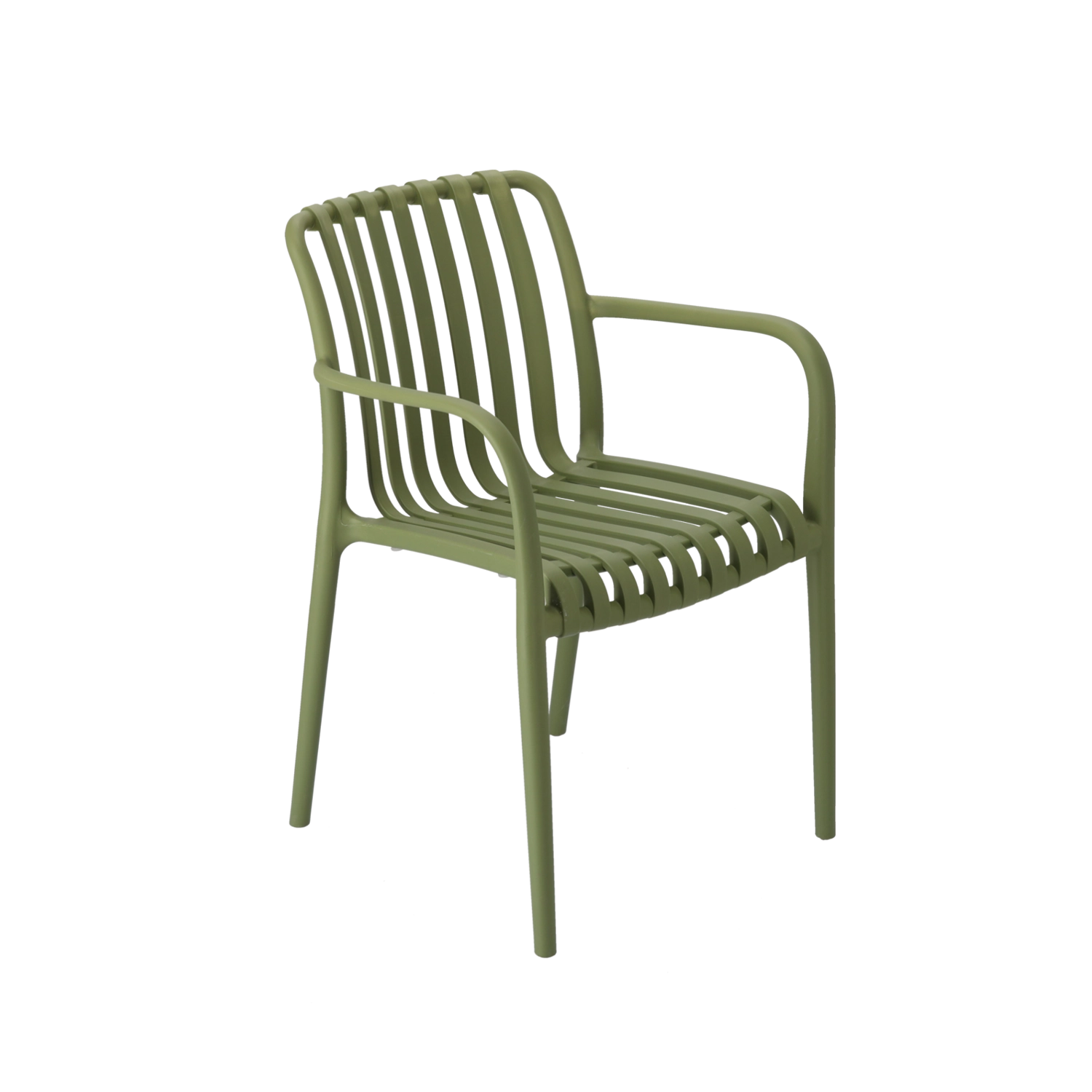 Praktična i izdržljiva vrtna stolica od čvrstog plastičnog materijala s UV filtrom u elegantnoj zelenoj boji. Idealna za vrt, terasu i balkon, nudi ergonomski oblik, otporna je na vremenske uvjete i lako se čisti. Maksimalna nosivost 110 kg.