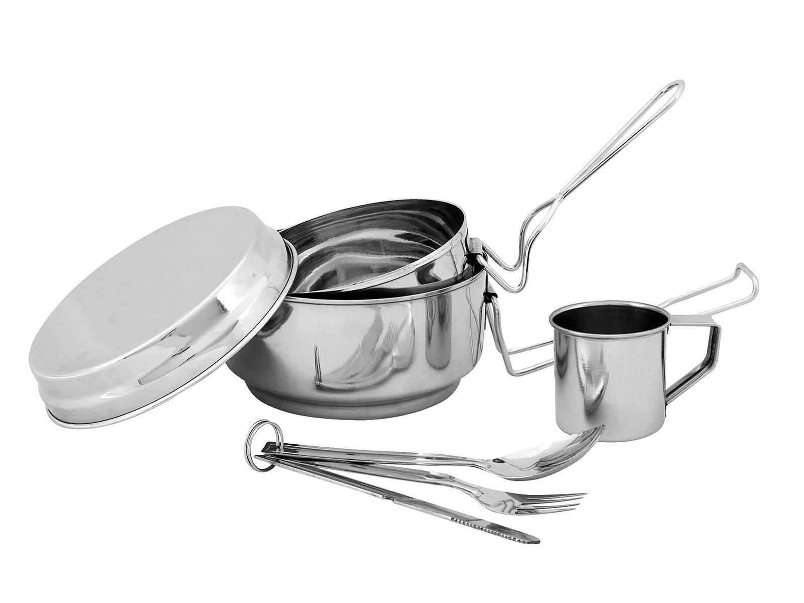 Dva lončića (15 cm i 13 cm), poklopac, metalna šalica i trodijelni pribor pokrivaju potrebe za kuhanjem i blagovanjem u prirodi.