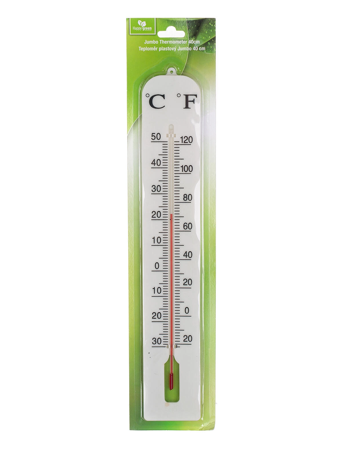 Praktičan plastični termometar HAPPY GREEN Jumbo duljine 40 cm nudi jednostavno i brzo očitavanje temperature. Ima dvije ljestvice u rasponu -30 do +50 °C i -20 do +120 °F, a zahvaljujući ušici za vješanje lako ga postavite na zid, balkon ili terasu.