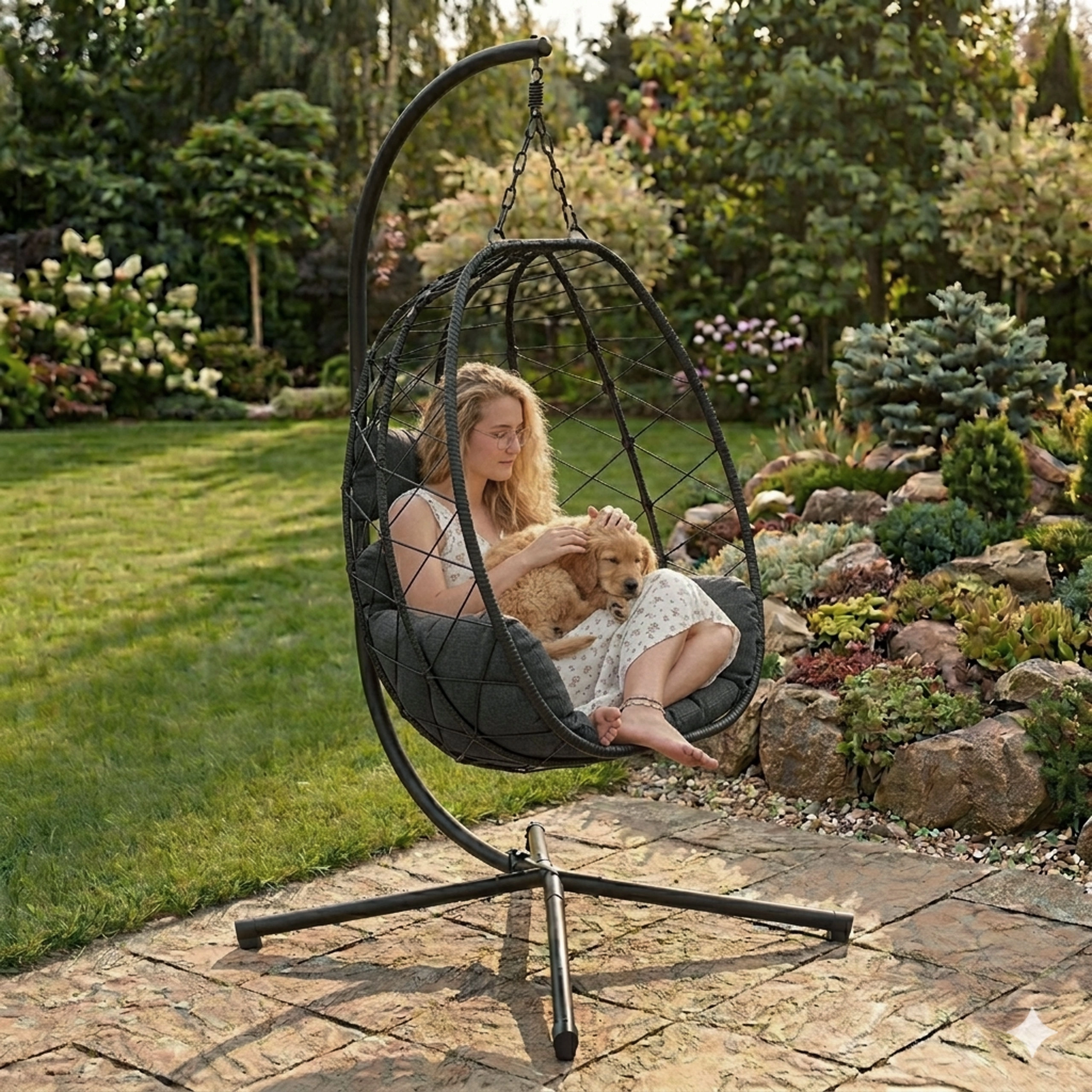 Robustan čelični okvir obložen tehno-ratanom otporan je na UV zračenje, vlagu i promjenjive vremenske uvjete. Lanac s oprugom osigurava glatko i tiho ljuljanje te smanjuje opterećenje konstrukcije. Četveronožna baza s protukliznim završecima stabilno stoji i na manje ravnim površinama te štiti pod od ogrebotina.
