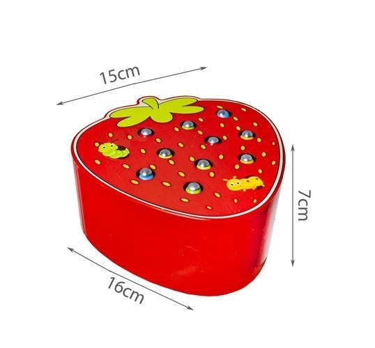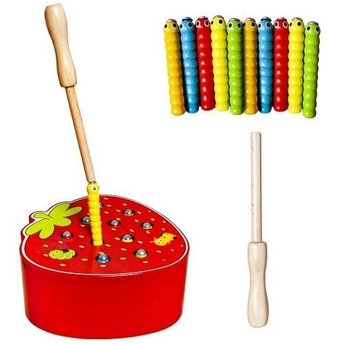 Zabavna drvena igra u obliku ukusne jagode razvija finu motoriku i koncentraciju. Djeca pomoću magnetske štapić-šipke izvlače i umeću crviće u otvore. Igra je izrađena od sigurnih materijala i ima žive boje koje potiču djecu na igru i učenje. Odličan izbor za razvoj koordinacije oko–ruka, kreativnosti i strpljenja.