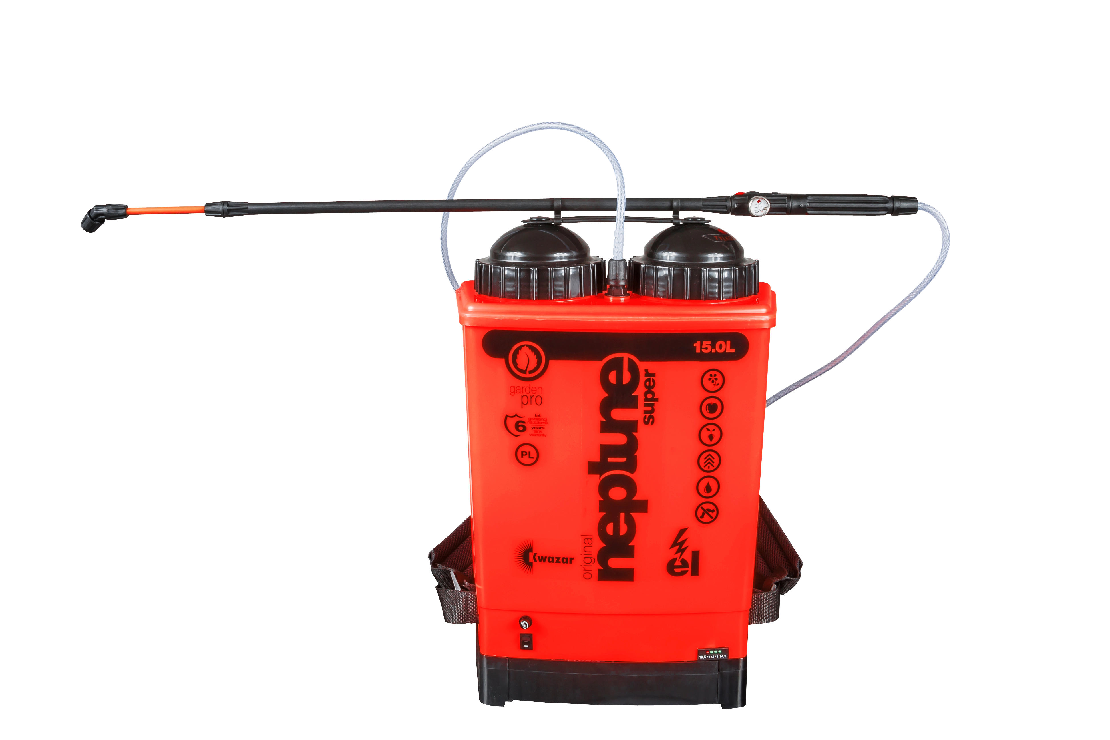 NEPTUN GARDEN 15 l je profesionalna leđna prskalica pokretana 12V gel baterijom koja osigurava ravnomjerno i precizno prskanje bez napora. Samostalni tlačni spremnik unutar rezervoara održava stabilan tlak, dok trostupanjska filtracija štiti pumpu i mlaznice od nečistoća. Vodoznak na spremniku omogućuje precizno mjerenje razine i volumena prskane tekućine.