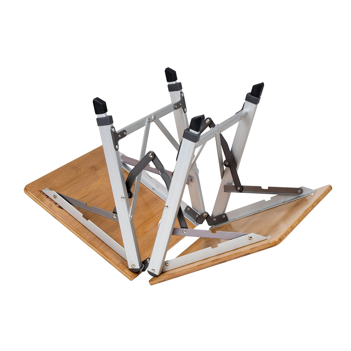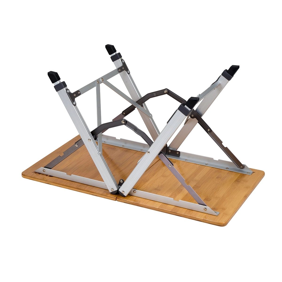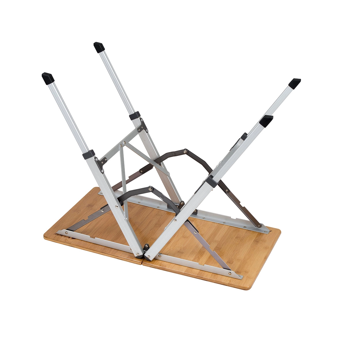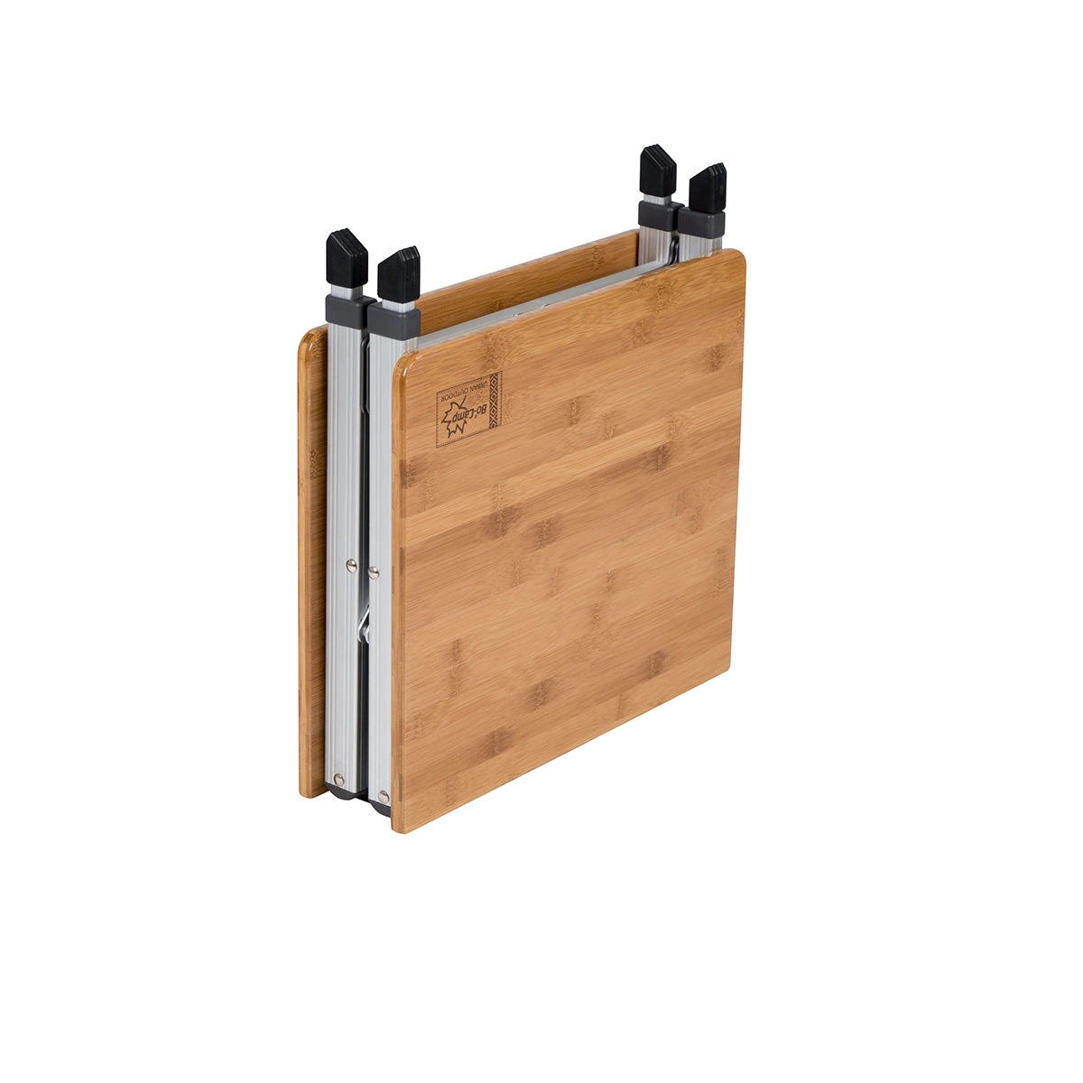 Elegantni sklopivi kamp-stolić s bambusnom pločom i laganim aluminijskim okvirom. Idealan za vrt, vikendicu i kampiranje. Vodootporna obrada štiti ploču od vlage, dva podesiva položaja visine osiguravaju udobnost pri sjedenju i pripremi hrane, a stabilna aluminijska konstrukcija pruža sigurnost na raznim podlogama.