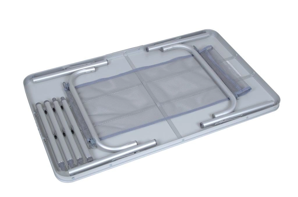 Zahvaljujući preciznoj vijčanoj regulaciji lako ćete podesiti visinu u rasponu 36–70 cm, a izravnavajuće noge osiguravaju stabilnost i na neravnom terenu. U kompletu je viseća mrežica ispod ploče za praktično odlaganje opreme. Nakon korištenja stol jednostavno sklopite – odvijajuće noge i tanak profil nakon sklapanja (100 × 60 × 3,5 cm) olakšavaju transport i skladištenje. Tu je i udobna ručka za nošenje.
