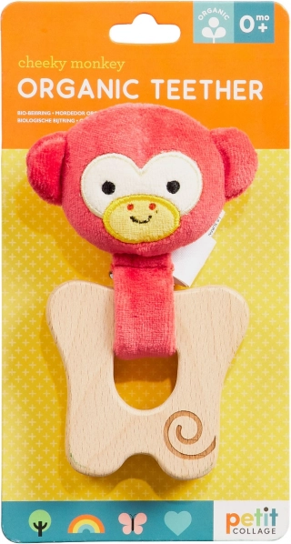 Preslatka grickalica Petit Collage u obliku majmunčića kombinira mekani organski pamuk i čvrsto FSC bukovo drvo za sigurno i umirujuće grickanje. Zahvaljujući lakom držanju za male ruke idealna je od rođenja i pomaže pri rastu prvih zubića. Izrađeno s obzirom na prirodu – bez plastične ambalaže i s punjenjem od recikliranih materijala.