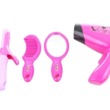 Ovaj ružičasti set ljepote nudi djeci sve što trebaju za prve frizerske eksperimente. Fen napajan 1× AA baterijom (nije uključena) nadopunjuju figaro, češalj, ručno ogledalce i kozmetički dodaci – sve prilagođeno malim dječjim rukama.