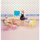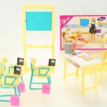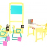 U pakiranju se nalazi prostrana ploča, učiteljski kutak s računalom i stolice za učenike. Zahvaljujući kompaktnim dimenzijama, set je kompatibilan s uobičajenim lutkama i lako se sprema.