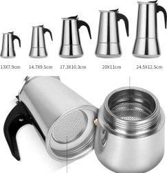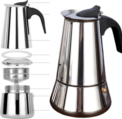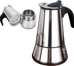Az akár 12 csésze kapacitás praktikus segítőtárssá teszi család és vendégek számára. A hőálló fogantyú megkönnyíti a kiöntést, a rozsdamentes acél pedig hosszú élettartamot és karcállóságot biztosít. A kávéfőző gáz- és elektromos tűzhelyen is használható, és a készítés után könnyen szétszedhető és tisztítható.