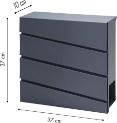 A felszerelés egyszerű a mellékelt rögzítő dübeleknek köszönhetően, a postaládához pedig két kulcs tartozik a biztonságos záráshoz. A 37 cm x 37 cm x 10 cm-es méretek elegendő kapacitást biztosítanak a mindennapi postához.