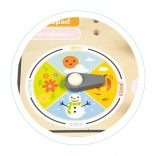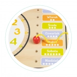 Engedje meg gyermekeinek, hogy felfedezzék a világot ezzel a színes és biztonságos fatáblával. Megtanítja a gyerekeket felismerni a hét napjait, a napok és hónapok sorrendjét. Speciális mezők segítségével a gyerekek fonallal és facsipeszekkel jelölhetik meg a naptár napjait.