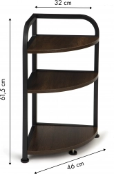 Ez a modern sarokpolc loft stílusban ideális a nappaliba, hálószobába vagy fürdőszobába. Stabil szerkezet, három polc és porfestett fémkeret biztosítja a hosszú élettartamot és a stílusos megjelenést.