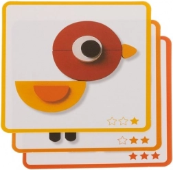 Fedezze fel a játékos tanulás varázsát! Ez a fa kirakó a geometriai formákat és az élénk színeket ötvözi, hogy a gyerekek könnyedén alkothassanak állatfigurákat a mellékelt mintakártyák alapján. A kártyák csillagokkal jelöltek, és három nehézségi szinten, lépésről lépésre vezetik a gyerekeket.