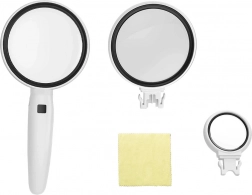 Praktikus kézi nagyító ergonomikus markolattal és 2x LED világítással a részletek tiszta, kényelmes megtekintéséhez. A csomagban 3 cserélhető lencse található 3,5x, 5x és 11x nagyítással, ideális olvasáshoz, numizmatikához, ékszerekhez és precíz otthoni munkákhoz. Tápellátását 3× LR44 elem biztosítja (tartozék).