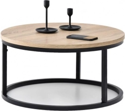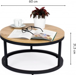 Stílusos, kerek dohányzóasztal 60 cm átmérővel, modern loft stílusban. Tartós laminált lap faforgácslapból, stabil fém váz porszórt festéssel és a padlót védő talpak. Könnyen karbantartható, ideális nappaliba és hálószobába.