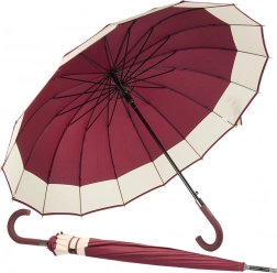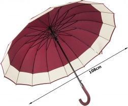 Stílusos és megbízható esernyő 16 masszív bordával és erős fém szerkezettel, amely a szélnek is ellenáll. A csúszásmentes, formázott fogantyú kényelmes fogást biztosít, elegáns két színű dizájnja pedig bármely öltözethez illik. A 108 cm tetőátmérő kiváló védelmet nyújt az eső ellen.