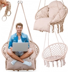 Ez a függő hintaszék kényelmes ülést kínál a pihenés és a lágy ringatózás pillanataihoz. A nagy, kör alak és a puha párna támogatják az ergonomikus testtartást, míg a masszív pamut kötélfonat és a fém váz biztonságot és hosszú élettartamot adnak.