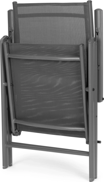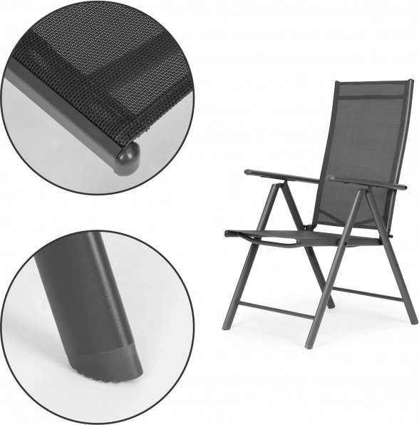 Élvezze a kültéri pihenést bármikor. Ezek az összecsukható székek 7 fokozatban állítható háttámlával lehetővé teszik az ideális pozíció beállítását – az asztalnál történő egyenes üléstől egészen a kényelmes olvasós pihenésig. A masszív, porszórt acél váz stabilitást és hosszú élettartamot biztosít, míg a textilén a testhez idomul és remekül szellőzik.
