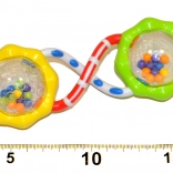 A súlyzó formájú csörgő ideális első játék a babáknak. Az átlátszó végekben lévő színes gyöngyök érdekes vizuális hatásokat és kellemes csörgést hoznak létre, amelyek ösztönzik a gyermeket a megfogásra és felfedezésre. Kompakt méretének köszönhetően kényelmesen elfér minden kisgyermek kezében.