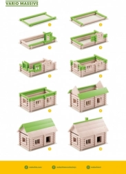 Az összerakható fa VARIO MASSIVE mini építőkészlet 91 darabot tartalmaz minőségi bükkfa rönkökből legalább 12-féle építmény megépítéséhez. A precíz marással készült félköríves illesztéseknek köszönhetően az építmények könnyen össze- és szétszerelhetők, a tömör fából készült ablakok és ajtók egyszerűen illeszthetők a falakba. Minden erős, füllel ellátott dobozban kap helyet a hosszú élettartam és a kényelmes hordozhatóság érdekében.