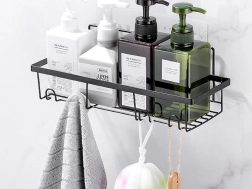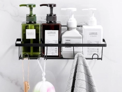 Két szintű tárolóhellyel és négy akasztóval ideális a higiéniai termékek rendszerezéséhez.