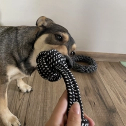 Az erős fekete-fehér kötél és a texturált narancssárga gumi bírja az intenzív igénybevételt, és segít a fogak tisztításában, valamint az íny masszírozásában játék közben.