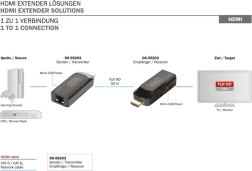 A DIGITUS HDMI konverter készlet lehetővé teszi a HDMI kábelek standard hosszának meghosszabbítását 50 méterre egyetlen hálózati kábellel (Cat 6/6A/7). Ezzel a bővítéssel könnyen és diszkréten áthelyezheti a képernyőt a kívánt helyre.